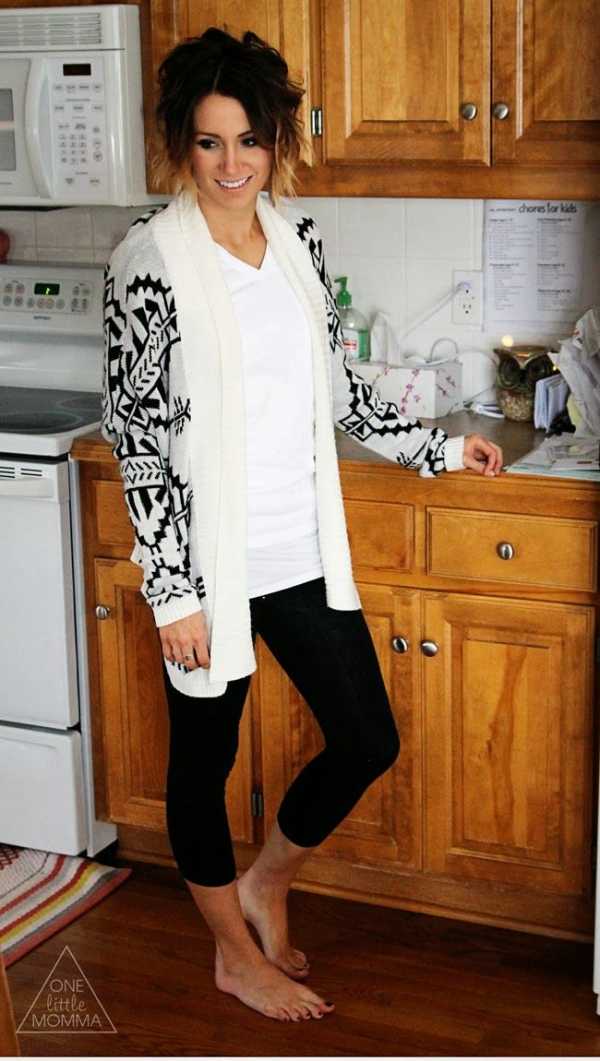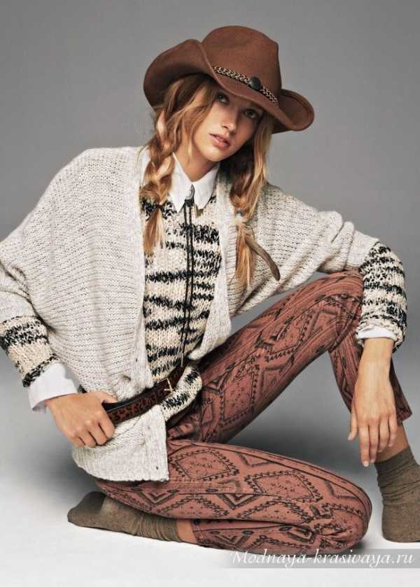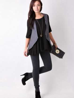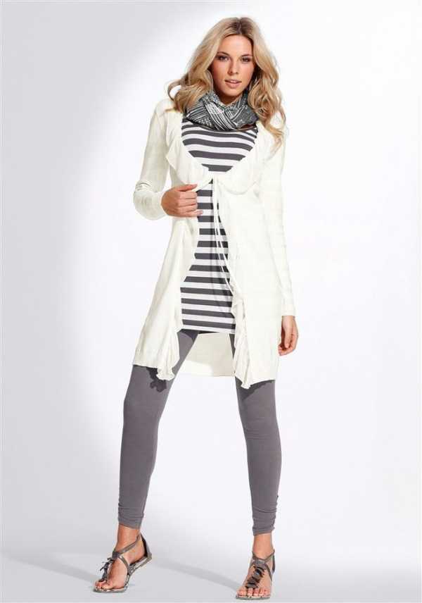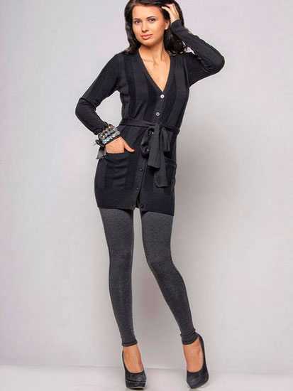 Кардиган. Эта верхняя одежда с плотными легинсами красиво смотрится прохладной весной или осенью. Под кардиган можно надеть теплый свитер или тунику, обувь может быть на высоком каблуке или на низкой подошве.