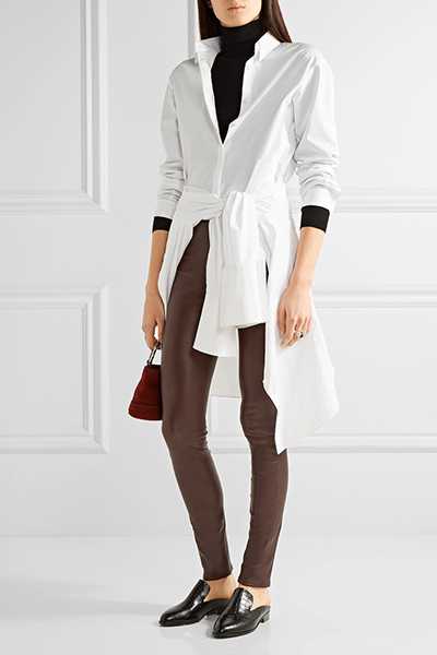 Легинсы и длинная рубашка. Сочетание этой смелой одежды с легкой рубашкой, едва прикрывающей ягодицы, считается одним из наиболее ярких и стильных в 2019 году. Джинсовая или кожаная куртка идеально подходит в качестве верхней одежды для весенне-осеннего сезона. Легкий модный пиджак можно накинуть сверху рубашки и прохладным летним днем. Дополнить стильный образ поможет широкий кожаный пояс. К такому стилю лучше всего подобрать обувь на каблуке – босоножки, туфли или ботильоны.