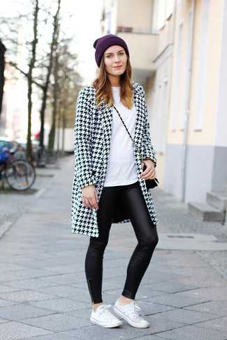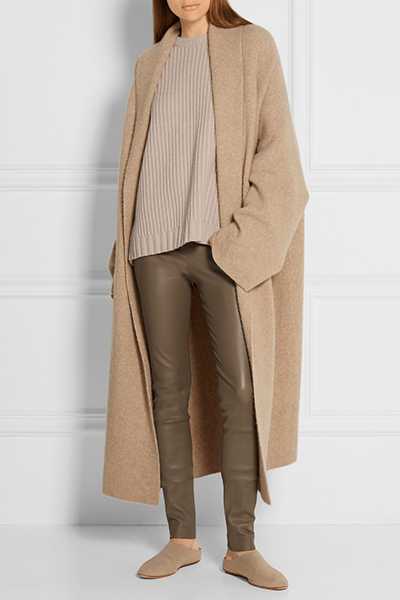 Выбирая, что носить с легинсами из верхней одежды в холодный период, можно отдать предпочтение кардиганам, приталенным пальто, плащам. В комплекте, где присутствует юбка, может быть кожаная косуха.