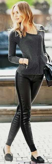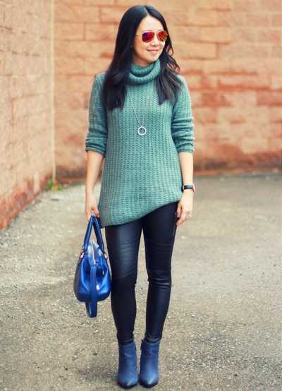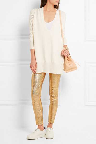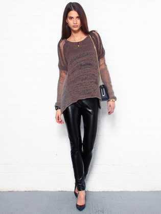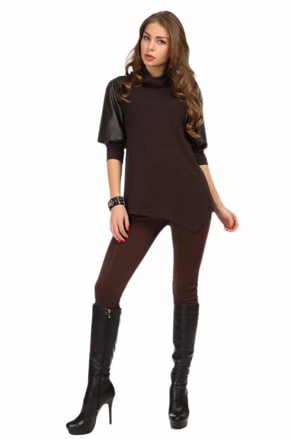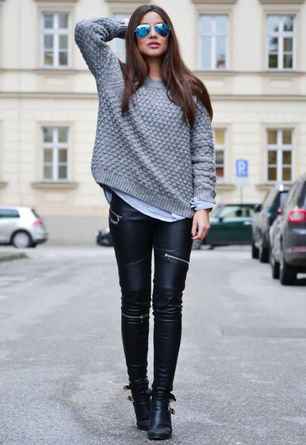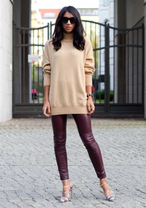 Утепленные кожаные легинсы — хорошее решение для холодной поры. Их можно дополнить вязаными туниками, оригинальными свитерами, кардиганами. Цвет верха зависит от предназначения комплекта. Деловой вариант предусматривает нейтральные, классические тона, отсутствие декора. Повседневные комплекты могут быть яркими, экстравагантными.