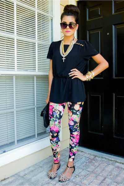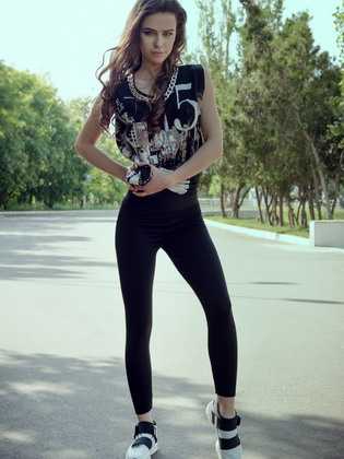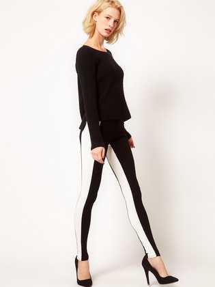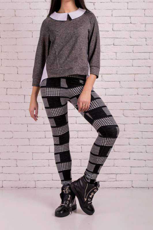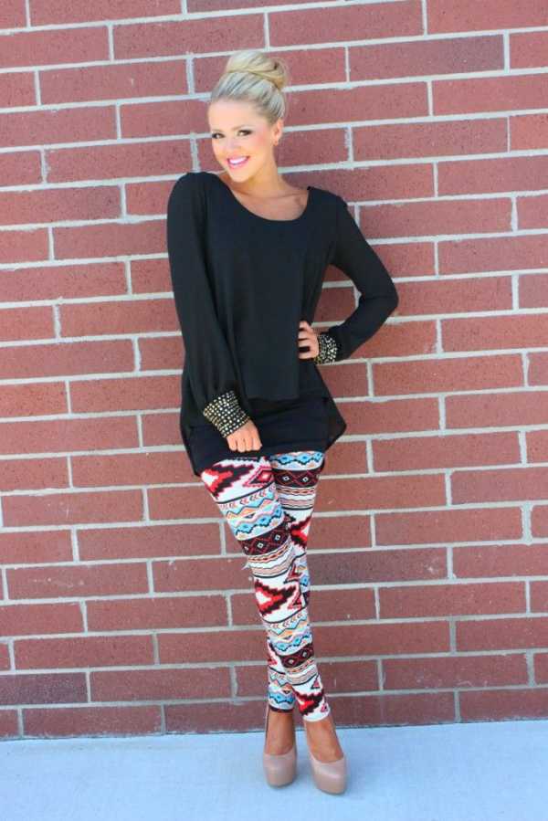 Если лосины выдержаны в черном и белом цвете одновременно, они будут гармонировать только с однотонным верхом – блузой или туникой. Верхнюю часть наряда можно подобрать, как в тон лосин, так и под цвет аксессуаров.
