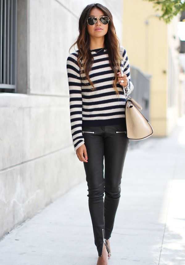 Главным условием соединения вещей является их совместимость по стилю и целевой направленности. Создавая деловые образы, используйте элегантные блузы, изысканные кофты, стильные пиджаки, подбирая под них сдержанные брюки без лишних элементов декора. Любительницам уличного стиля стоит обратить внимание на рваные легинсы с прорезями на попе или коленах, соединенные с вещами свободного кроя или кожаными изделиями направления панк рок. Собираясь на романтическое свидание, наденьте облегающие брюки с декоративной вышивкой на бедрах и замочками внизу штанин, дополнив образ ажурной вязаной туникой с приспущенным плечом.