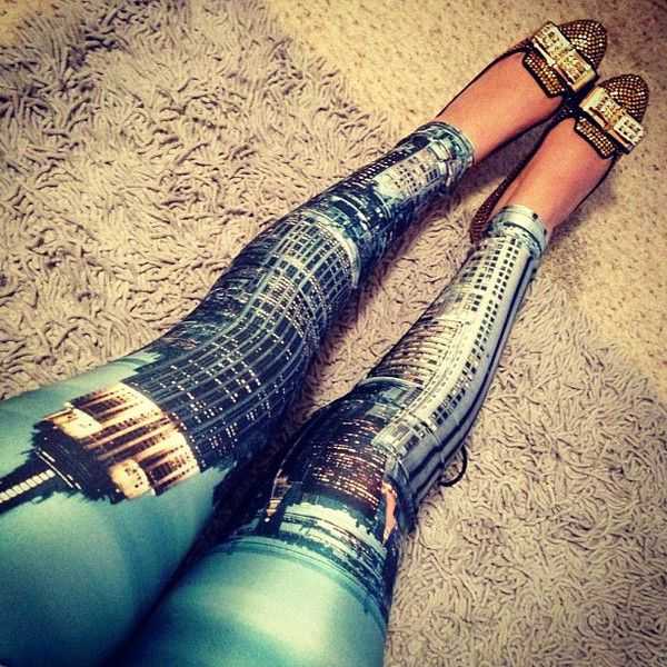 При этом осторожно выбирайте принт. Например, этот рисунок с многоэтажными домами будет зрительно искривлять ноги. Таких кривых домов не бывает.