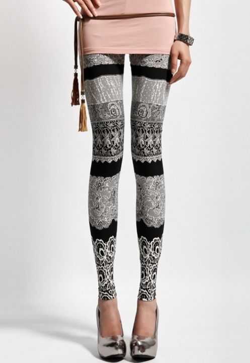 Ниже на фото, с чем носить черные легинсы, нельзя оставить без внимания яркий и в то же время сдержанный образ – лосины с узором на черном фоне с белой кружевной блузкой: