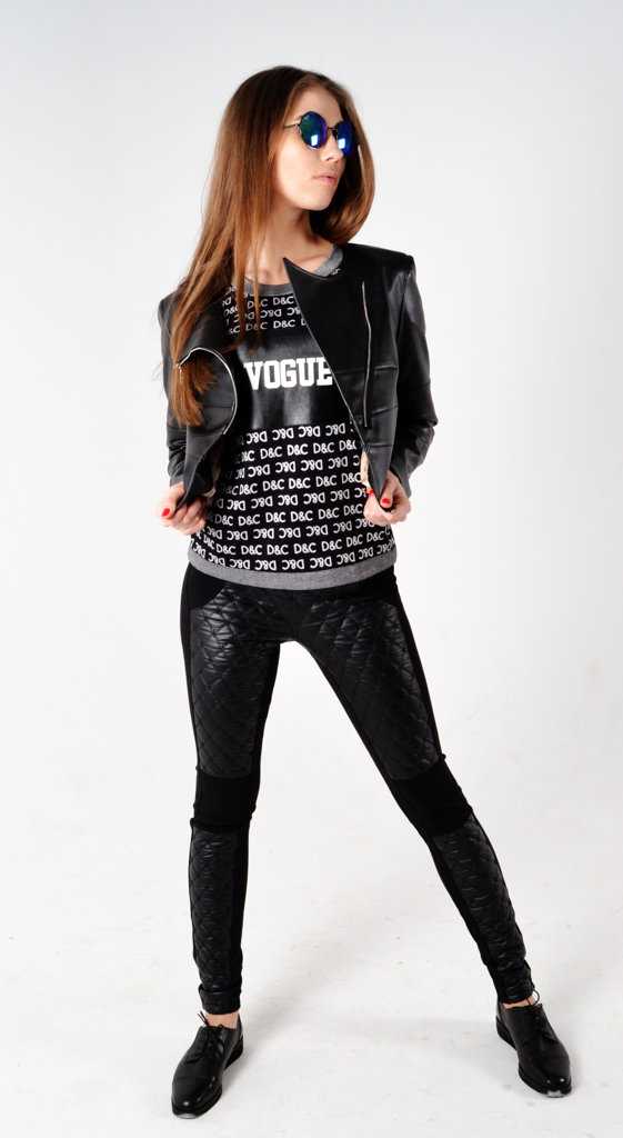 - Если подобрать жакет или куртку в цвет лосин, то образ станет значительно более цельными и интересным, силуэт вытянется, а акцент сместится с лосин на футболку / блузку или аксессуары.