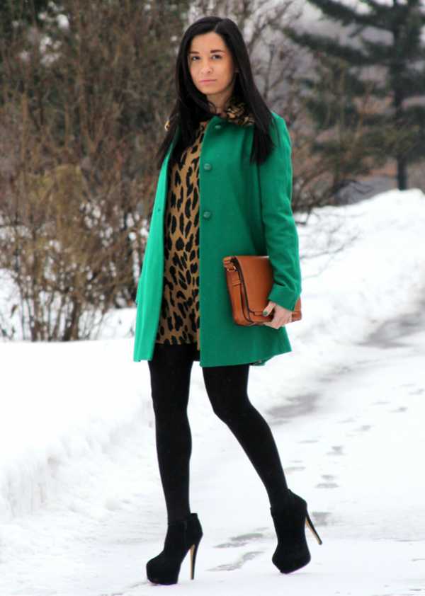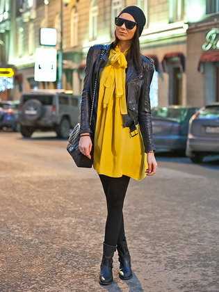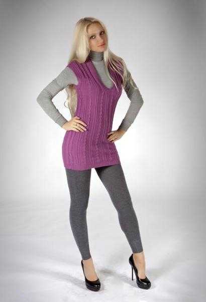 Теплое платье – один из лучших вариантов, с чем носить лосины в осенне-зимний сезон. Прекрасным дополнением к наряду станут высокие сапоги на каблуке и меховая жилетка. Зимой или холодной осенью вместо жилетки можно надеть пальто или шубу, весной – пиджак. Важно знать, что с плотными легинсами красиво смотрятся только легкие модели платьев и туник, и, наоборот – с теплыми платьями нужно носить тонкие лосины.