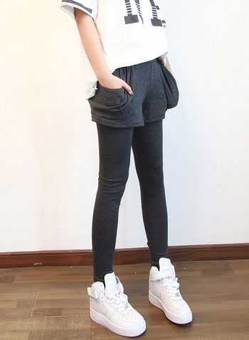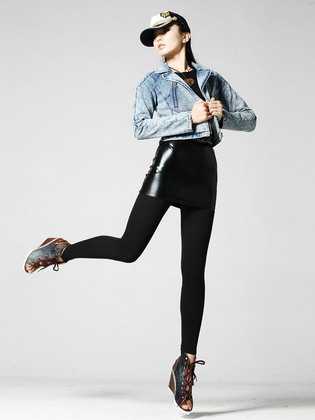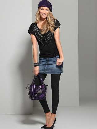 Короткая юбка. Она смотрится с легинсами не хуже, чем платье. Пожалуй, самым оптимальным вариантом станет джинсовая юбочка, можно выбрать плиссированную модель, особенно, если вы являетесь обладательницей красивых стройных ножек. Плотные легинсы, короткая джинсовая юбка, кожаная куртка и высокие сапоги на каблуке – отличный наряд для современной молодежи.