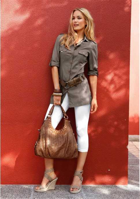 Удлиненная блузка, туника станут хорошей парой с ними в теплое время года. Можно выбрать укороченную футболку, сексуальный топ. Верх зависит от настроения ансамбля.