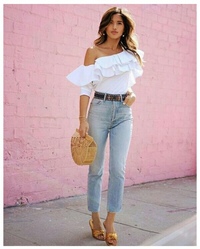 Если ваш рабочий дресс-код не скован строгими рамками, то классические или расклешенные модели можно носить с простыми рубашками и блузками. Стильный образ с джинсами для девушек представлен и в стиле романтик с красивыми кофточками и обувью на каблуке. Любой фасон можно носить с удобными свитерами, бомбером, кроссовками, что соответствует кэжуальному луку.