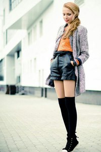 Из верхней одежды с теплыми шортами отлично сочетаются укороченные пальто или короткие куртки (длина чуть выше колена). Для того, чтобы подчеркнуть линию талии можно использовать стильный кожаный ремень.