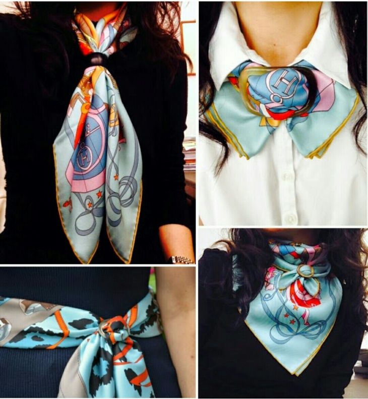 Вот , как носить маленький квадратный шарф с помощью кольца: все, что вам нужно сделать, это сложить квадратный шелковый шарф в треугольник, накинуть его на голову, а затем протянуть два конца через кольцо – готово. ! Это все, что нужно, чтобы создать культовый образ и заворожить всех своим стилем.