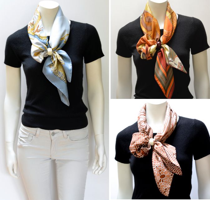Такие аксессуары должны быть в гардеробе каждой бизнес-леди. Французскими косынками называют платки, имеющие небольшую петельку. Они могут быть завязанными в веерный узелок, цветочный узел или бант.