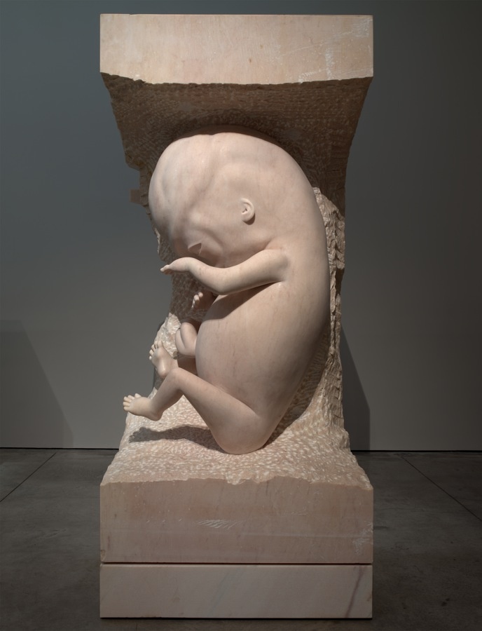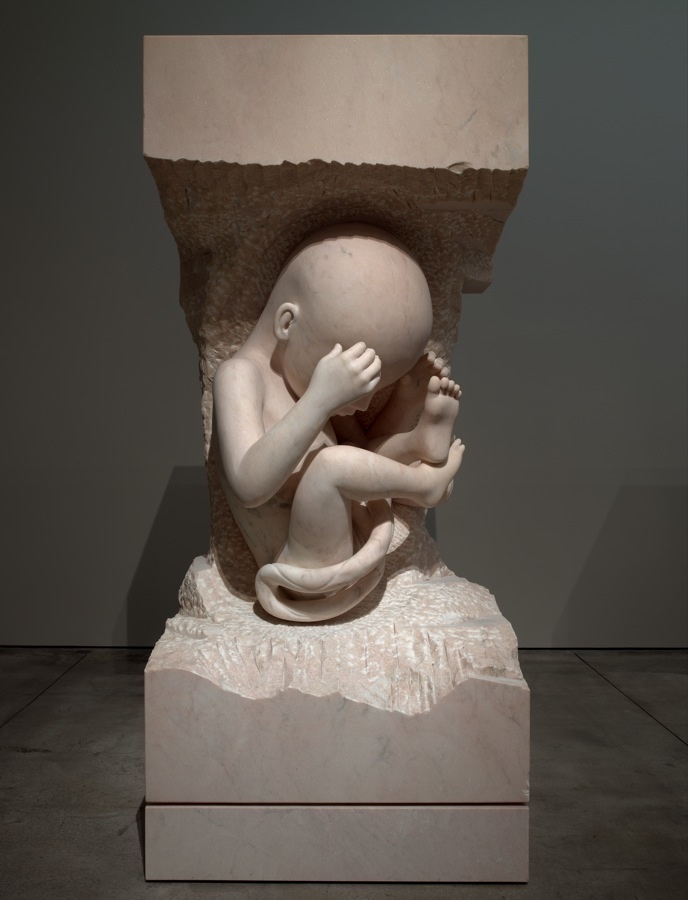 Вроде итальянца Фабио Виале, который в мраморе имитирует пенопласт и резину, или Алексея Морозова, который тоже в мраморе ваяет античных весталок на сегвеях. Обладая ремесленным навыком, эти мастера развращают вечно тоскующую по «качеству» публику приятным парадоксом, рождающимся в результате сочетания академических и трудоемких материалов и как бы современных сюжетов. Марк Куинн на первый взгляд еще аморальнее этих двоих. Мало того что он работает в мраморе, бронзе и золоте, изображает он в основном запредельно медийных персонажей (Бритни Спирс, Кейт Мосс) в момент какого-нибудь неприличия: Бритни рожает на четвереньках, Кейт закидывает ногу за голову в йоговской асане. Можно было бы решить, что это фанатское приношение по какой-то случайности обученного скульптурному ремеслу клинического идиота, эмоционально недоразвитого, но при этом расторможенного — до такой степени непристойны и выхолощены эти работы. Но ни Кейт, не Бритни не являются фан-артом. Это даже не стопроцентный китч, как в случае с Виале и Морозовым.