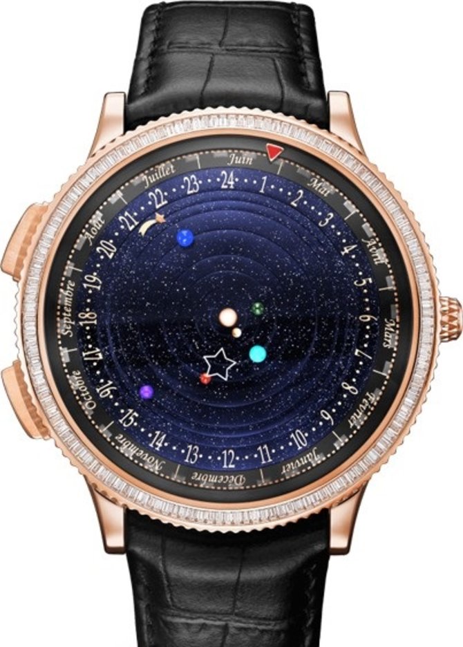 Часы Midnight Planétarium демонстрируют движение планет во Вселенной. Воссозданную в подробностях картину дополняет падающая звезда, которая указывает время. Звезда сулит удачу и приглашает вписать свой счастливый день в хоровод небесных тел. Циферблат украшен миниатюрным изображением Солнца и пяти планет, различимых с Земли невооруженным глазом: Меркурия, Венеры, Марса, Юпитера и Сатурна. Благодаря специально разработанному модулю каждая из планет вращается на циферблате с той же скоростью, что и в космическом пространстве.