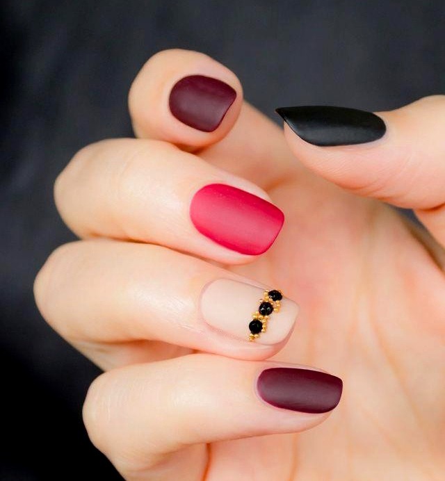 Даже самые яркие оттенки, в том числе красный, на коротких ногтях не будут выглядеть вызывающе, особенно в матовом виде. Лучший вариант для такой длины — однотонное покрытие, особенно если речь идет о простом повседневном или деловом маникюре. Но не возбраняется и оживить его несложными узорами, картинками, а если впереди вечеринка — то и стразами, но в меру.