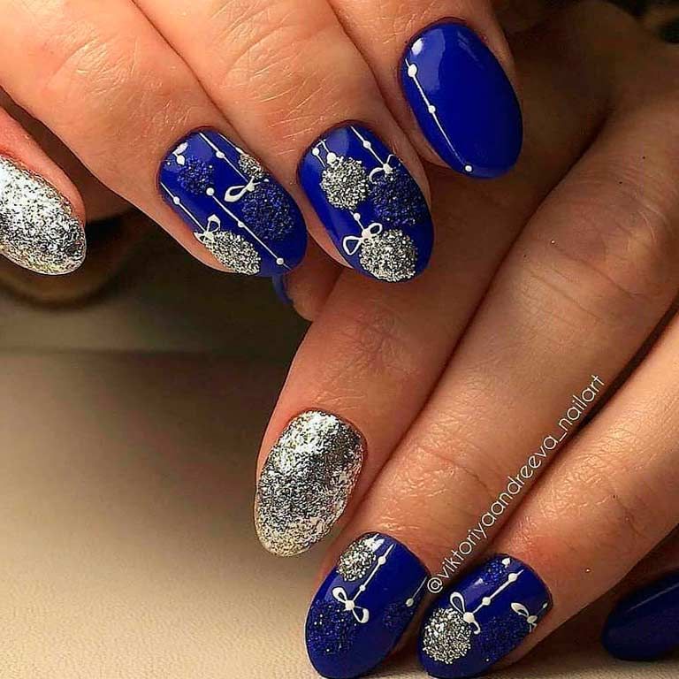 Для новогоднего торжества формы и длина ногтей не имеют особого значения. Главное чтобы их дизайн выглядел по-праздничному с обилием украшений в виде страз, блесток или оригинального рисунка.
