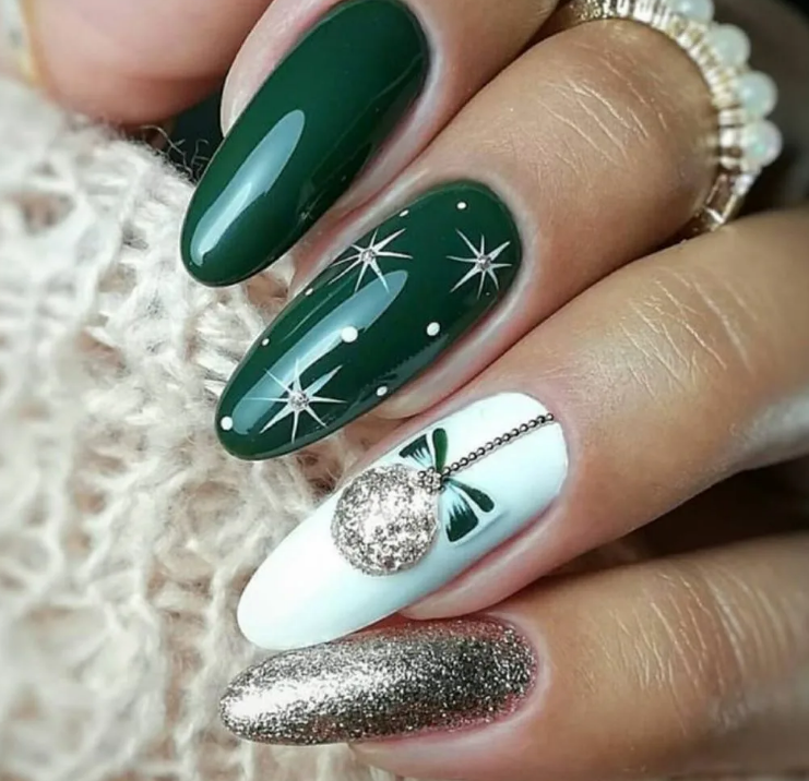 Именно эти оттенки используются в качестве основы для ногтевого дизайна. Поверх него можно выполнить рисунок новогодней тематики или просто посыпать ноготок блестками.