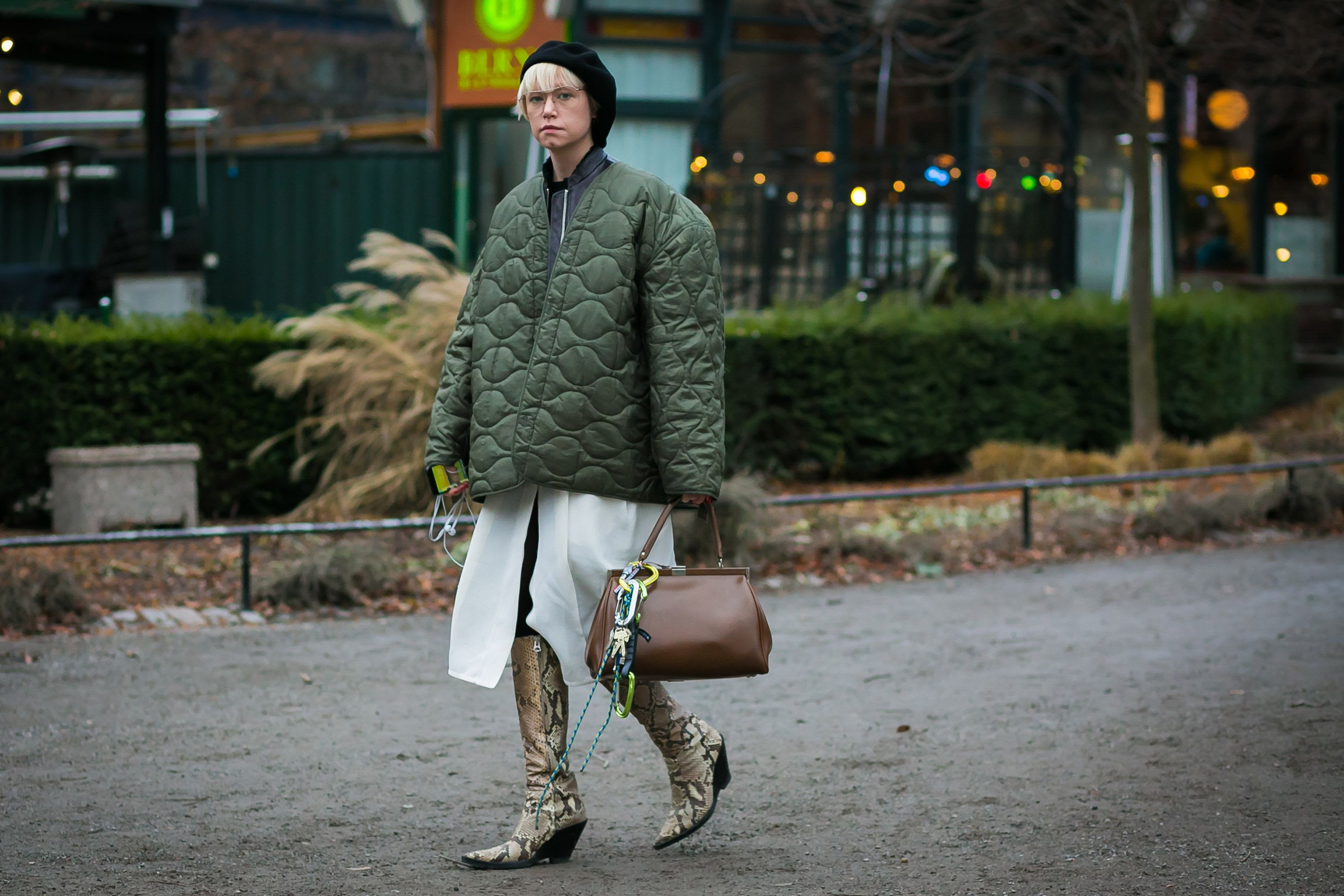 Платье-свитер с отделкой из искусственного меха, пальто в стиле милитари и клатчем / viaПоскольку мех сейчас является популярной тенденцией, мы хотели поделиться с вами еще одним способом заставить его работать. Ищите платье-свитер с меховой отделкой по цвету. А затем, в качестве резкого и в то же время удивительного контраста, возьмите пальто в стиле милитари. Это разумное финансовое вложение, потому что вы сможете носить его на многие будущие зимы.