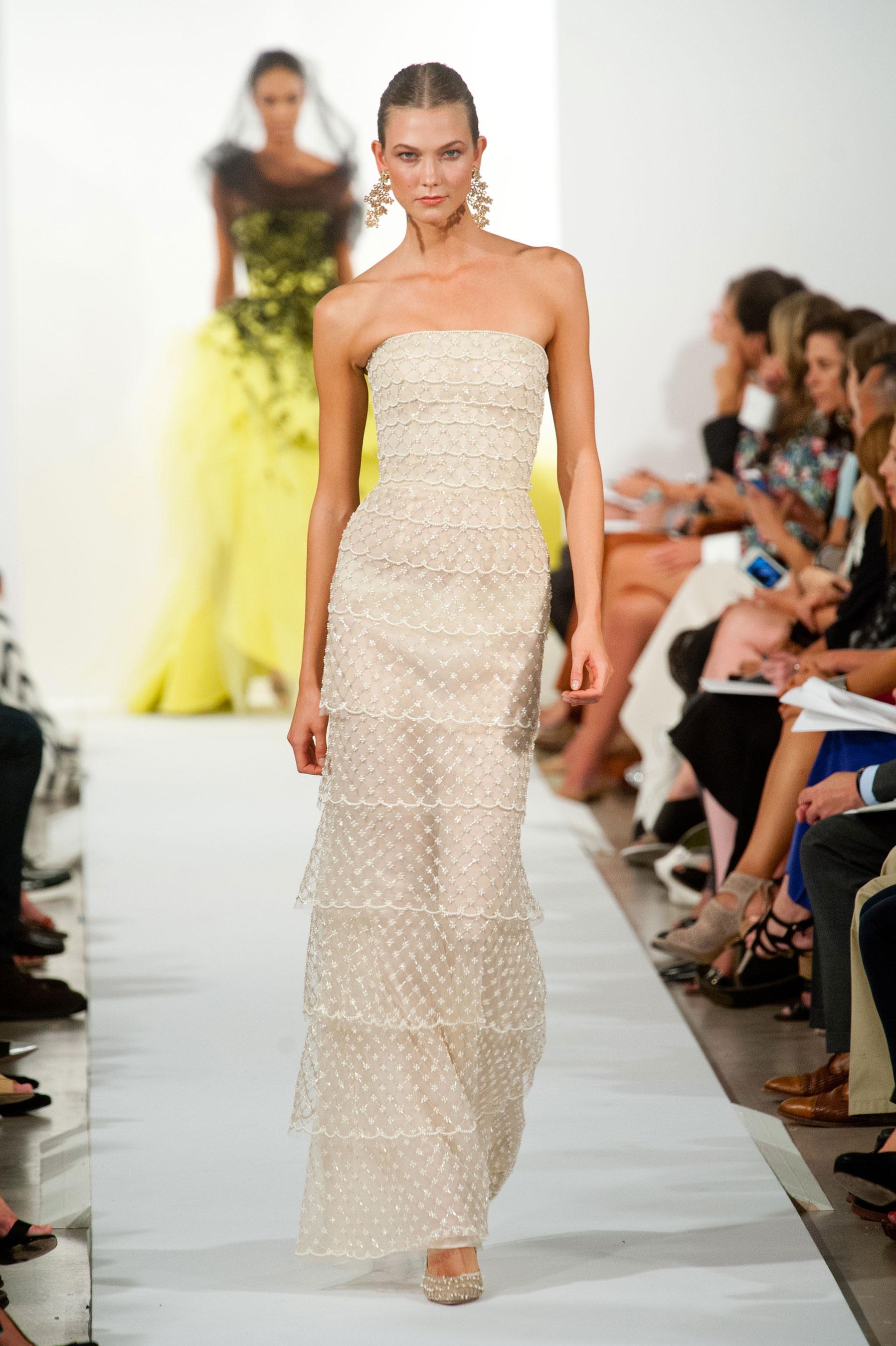 Блестящие вечерние платья всегда были главными героями коллекций De La Renta; Пышные юбки в сказочном стиле, созданные для современных принцесс, которые не задирают нос на технику, демонстрируют ценные чехлы для «айпадов».