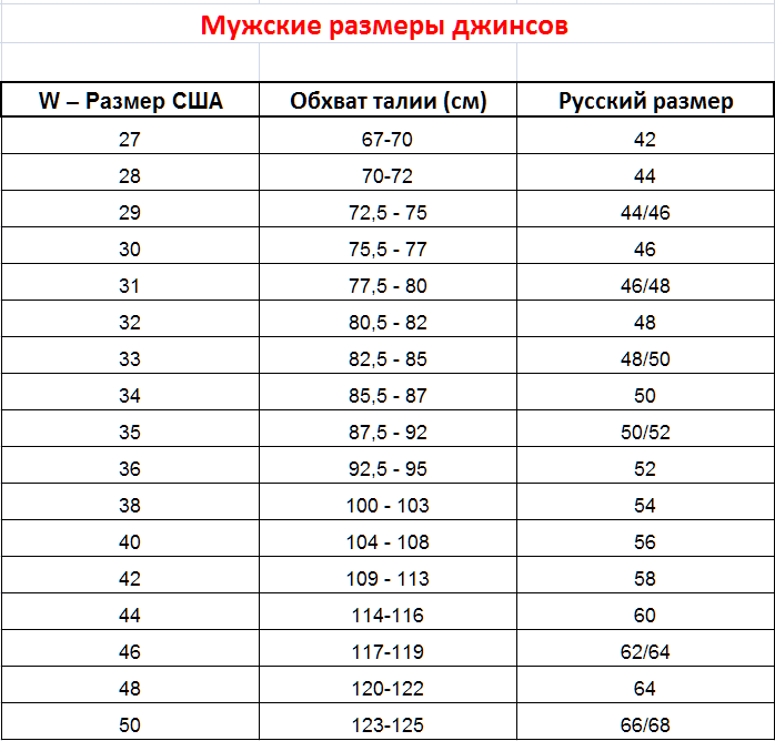 Эти параметры для мужчин и женщин определяются по-разному. Поэтому, чтобы узнать, какой размер соответствует 30 размеру джинсов для мужчин или женщин, следует ознакомиться со следующими таблицами: