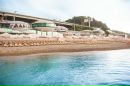Пляж большой, места всем хватает. Песчано-галечный: насыпной песок в зоне лежаков, крупная и средняя галька на входе в воду — желательно пользоваться аквашузами.