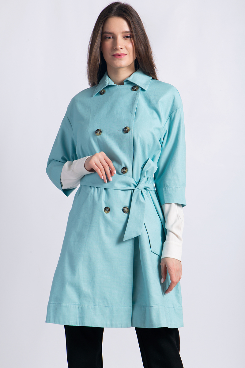 Плащ — тренчкот выполняется в модели прямого кроя, с декоративным элементом в виде двух рядов пуговиц, на один из которых изделие можно застегнуть. Помимо этого, изделие имеет широкий пояс, подчеркивающий линию талии.