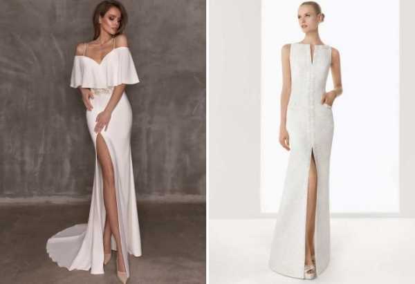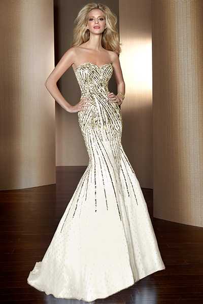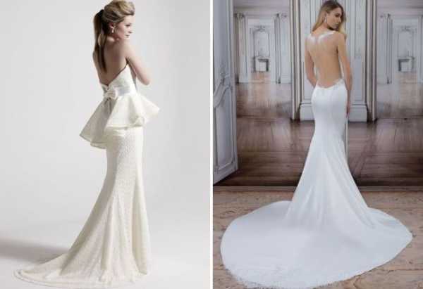Вечерний образ часто требует изящества и умеренной сексуальности. Отличным решением продемонстрировать такие качества будет наряд облегающего силуэта. Самым популярным выбором фасона в этом случае остается русалка без резких переходом и швов на юбке. Утонченную стройную фигуру прекрасно подчеркнет белое атласное платье в пол. И в этом случае уместным дополнением будет недлинный шлейф. Красивый блеск ткани идеально передаст торжественность и нарядность. Однако такие модели исключены для девушек с фигурой plus size, поскольку визуально добавляют объем.