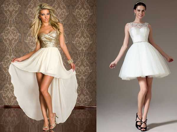 Если же девушка обладает стройной фигурой, идеальным вариантом станет короткое платье до колена с асимметричной длиной. А красивое пышное платье с открытыми плечами придаст образу элегантности и женственности.