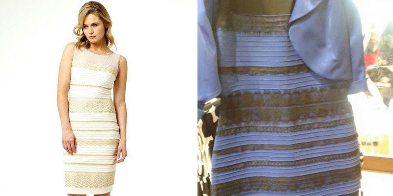 Весной 2015 года очередной интернет-знаменитостью стало не животное или человек, а свадебное платье из соцсети Tumblr. Тысячи пользователей спорили о том, какого оно цвета — золотое или синее. В итоге выяснилось, что более 70% респондентов видят его в бело-золотой гамме и только треть опрошенных заявляют, что платье сине-черное. Позже обнаружилось, что есть еще одна небольшая группа людей, которым платье кажется коричневым.