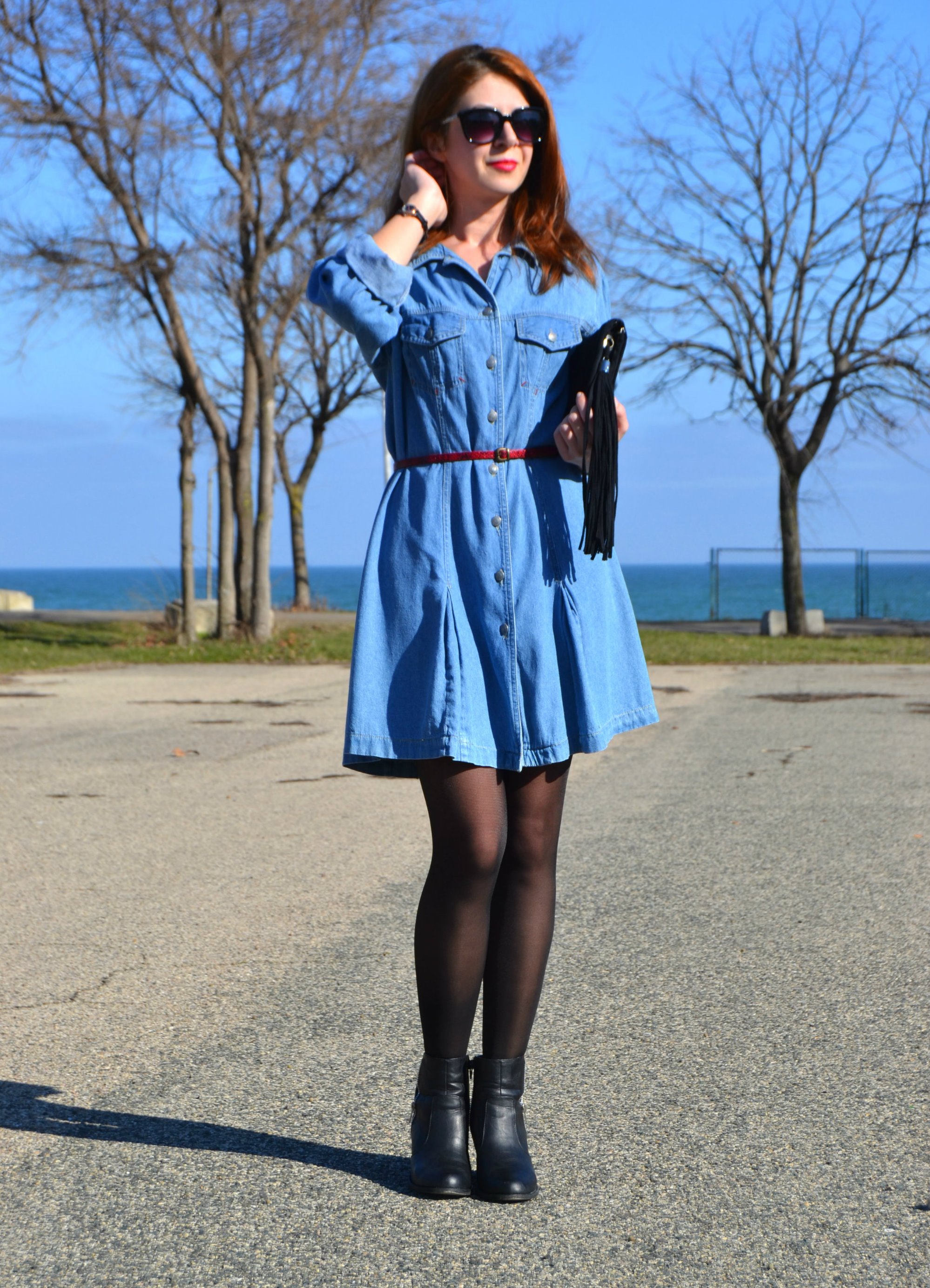 Приталенное платье с юбкой-солнцем в сочетании с замшевыми или кожаными (но лучше все-таки замшевыми – выглядит благородно) туфлями лодочками выглядит исключительно. Модный аксессуар прошлого сезона обещает быть популярным еще весь следующий год – чокер, аналогичного черного цвета подчеркнет вашу лебединую шею.