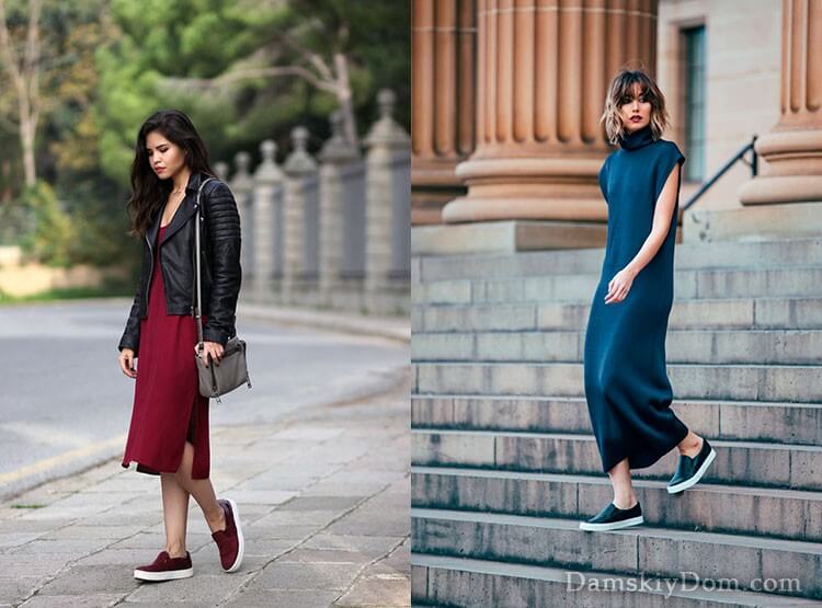 Беспроигрышными вариантом станет сочетание длинного спортивного платья со слипонами. Само платье может иметь один или два разреза по бокам. Это самый удобный ансамбль для пеших прогулок по городу, а также для утомительных походов по магазинам.