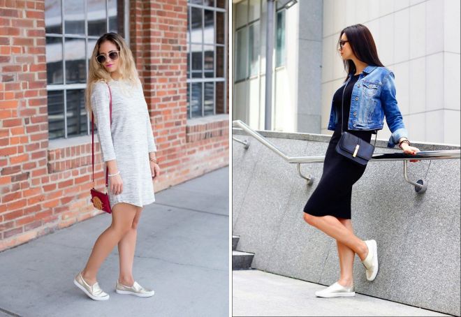 Лучше всего к слипонам подойдет вечернее платье из трикотажной ткани с чертами стиля кэжуал. А вот с коктейльными платьями на узеньких лямочках, как и с длинными платьями сарафанного кроя, лучше не экспериментировать.
