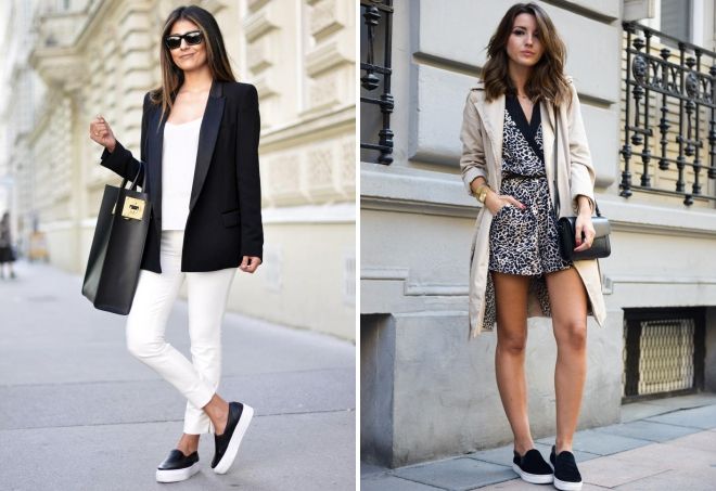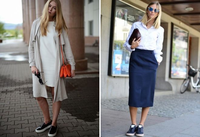 Не совсем удачно слипоны будут смотреться с брюками классического кроя, строгими деловыми юбочными костюмами, поскольку просто будут неуместны в данном образе. Соответственно с такими вещами, как бальные и вечерние платья, воздушные сарафаны из легкой струящейся ткани, тоже будут нелепо смотреться в сочетании со слипонами.