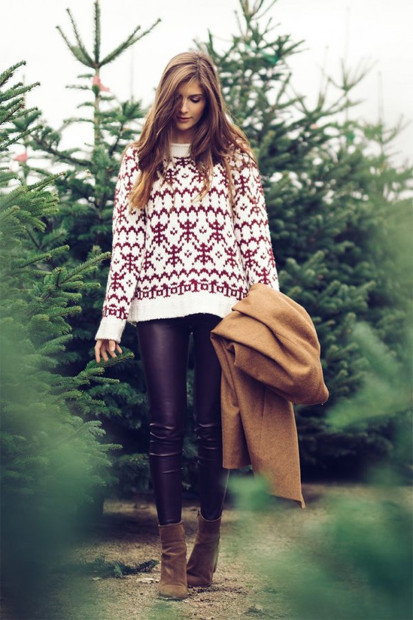 Очень модным будет образ для морозных зимних дней из трикотажного платья или юбки со скандинавскими узорами, который дополнен теплыми сапогами с опушкой. Однако не только при помощи меховых сапог можно подчеркнуть этот актуальный на сегодняшний день стиль. Отлично подойдет обувь на плоской подошве в виде замшевых или кожаных сапожек, либо унтов. Невысокий каблук также может присутствовать в скандинавском образе.