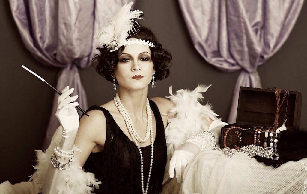 Укладываем волосы в мягкую волну и украшаем прическу повязками, перьями, бусами и фатой в стиле 30-х годов. Красиво дополнят образ нитки бус из их жемчуга. Для этого образа подойдут духи с пудровым или розовым ароматом.