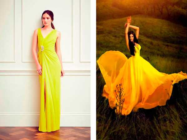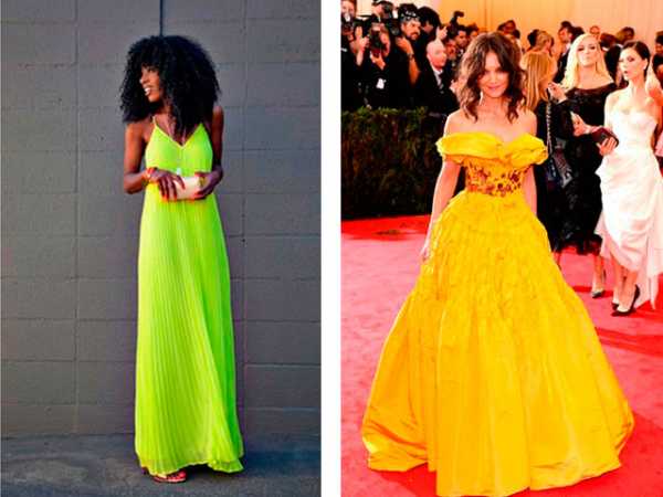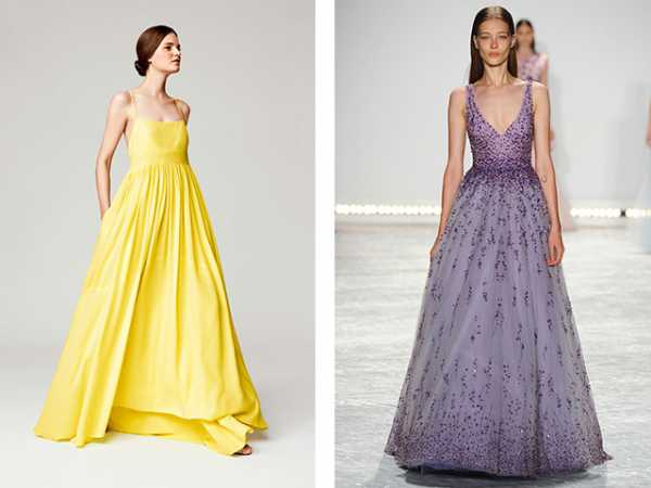 Для ярких и уверенных в себе подойдут насыщенные красочные оттенки: фиолетовый, красный, синий, желтый. Однако актуальными они будут только в облегающих или зауженных фасонах, в других случаях лучше выбирать платья с ярким подолом или только насыщенным корсетом.