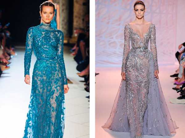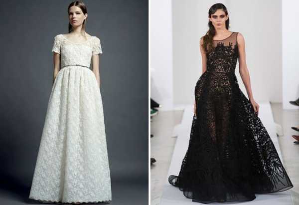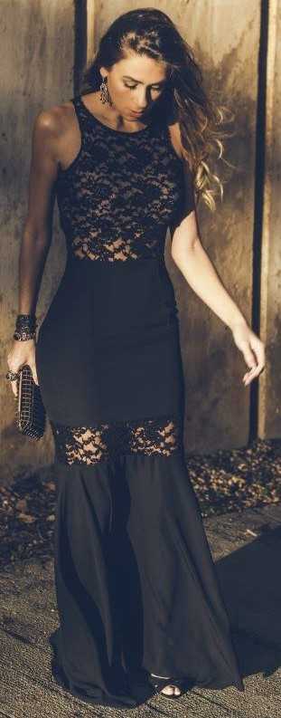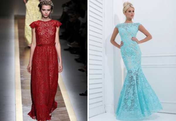 Гипюр находится в тренде, невозможно не влюбиться в его ажурность, легкость. Модные длинные платья из кружева выпускаются в разном формате. Это и прямые изделия, и прилегающие со шлейфом, со всевозможными вырезами и по-разному оформленными плечами. Кружево бесподобно смотрится на красотках всех возрастов, добавляет образу нежности, романтичности, воздушности. Под него необходимо подбирать изящные туфельки и аккуратный клатч. Но оно может скомпрометировать — следите, чтобы его прозрачность не конфликтовала с характером раута.