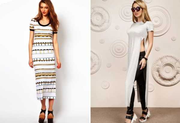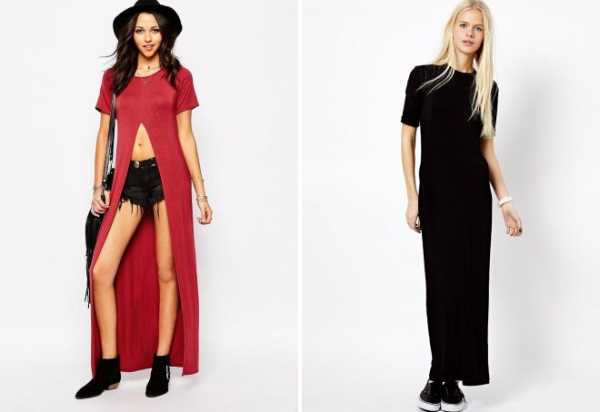Данное непосредственное, непринужденное решение прижилось среди молодежи, неплохо оно смотрится и на зрелых леди. Длинное трикотажное платье такого кроя часто выполняется из трикотажа, имеет короткий рукав. Талия на нем не акцентируется, оно шьется прямым, добавочные элементы также исключаются. Эти длинные платья хорошо уживаются с босоножками на платформе, другие же потрясающе гармонируют с сандалиями-гладиаторами. Футболка до щиколотки имеет право на глубокие разрезы почти до талии — они допускают комбинации верха с шортами.