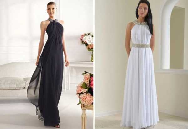Плечи оформляются по-разному — остаются оголенными или прикрываются драпировками, складками, небольшими рукавчиками. Вырез может быть треугольным, круглым, мысообразным. Сам фасон представляется в нескольких вариантах — греческий стиль проявляется и в приталенных моделях, и в туниках. Вечернее черное длинное платье с блестящим ожерельем или поясом-отделкой из сверкающих пайеток — отличный выбор для торжества.