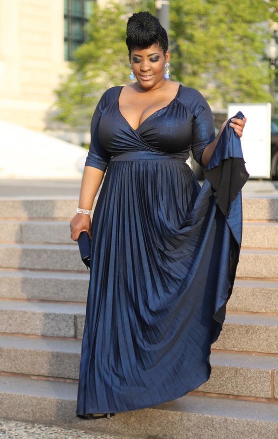 Традиционно, для грандиозного торжества, выбираются красивые платья в пол. Они очень идут женщинам с пышными формами, так как, в сочетании с туфлями на высоком каблуке, позволяют выглядеть стройнее. И очень женственно.