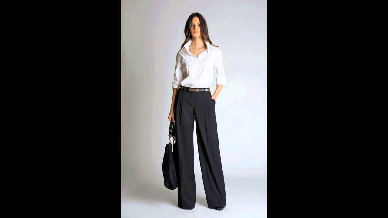 Классическая модель широких брюк прямого кроя со стрелками, будет отлично сочетаться с обтягивающими трикотажными блузками, с v-образным вырезом. Образ получается классическим и вполне вписывается в рамки офисного дресс-кода, не выбиваясь какими-либо деталями. Наиболее удачно будет смотреться вариант заправленной вовнутрь блузки, тогда, возможно, актуально будет использование тонкого черного ремешка с серебристой пряжкой.