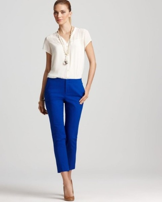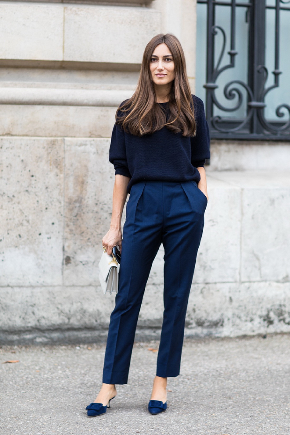 А вот классические или чуть зауженные к низу брюки вы можете смело комбинировать со всем, что вам нравится, от приталенных блуз, до легких джемперов из тонкой шерсти.