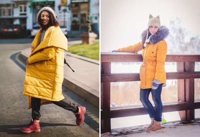 Отличным выбором для активной повседневной носки как в демисезонный период, так и зимой считается практичная и комфортная куртка. В насыщенном броском оттенке парки смотрятся по-особенному привлекательно и способны эффектно разбавить закрытый лук. Горчичная куртка может выступать главным элементом в образе. Однако чтобы выглядеть необычно и выделяться на фоне остальных, дизайнеры предлагают дополнять такую одежду контрастными аксессуарами, например, яркими вязаными изделиями. Удачной обувью к такому фасону будут кроссовки, ботинки-тракторы на шнуровке или угги.