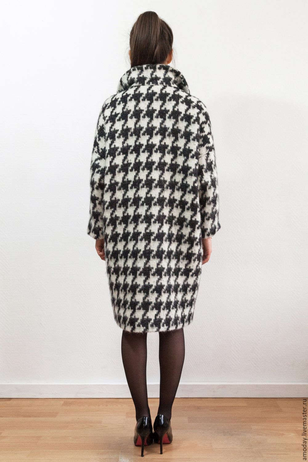- Пальто любого кроя, отшитое из плотной ткани с нанесенным узором, будет элегантным и стильным. Самые распространенные расцветки – это черно-белая цветовая гамма, серо-черная, красно-черная и сине-белая.