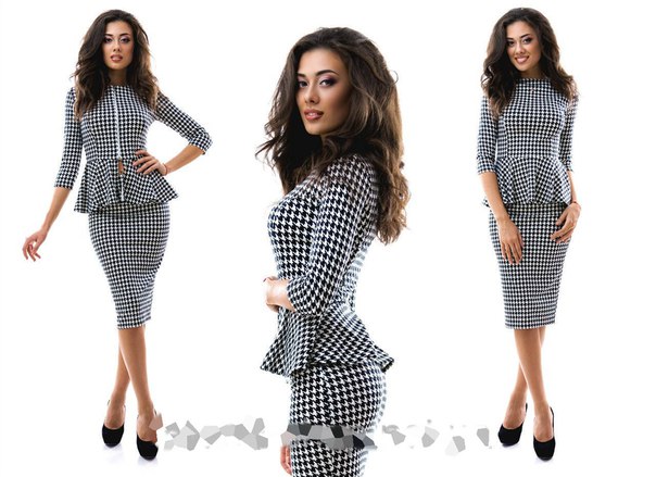 - Он очень пестрый, хотя применяется сочетание только двух цветов. Особенно эта черта проявляется, когда используется узор «мелкая гусиная лапка», часто повторяющийся. Поэтому, как и любой мелкий рисунок по ткани, он способен визуально увеличивать объемы. Этим обусловлено то, что такие вариации моделей идеально подойдут худеньким и стройным барышням.