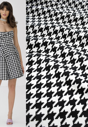 Ее название, как на русском, так и английском языках, имеет прямую связь с внешним видом: форма рисунка похожа на острую гусиную лапку или же собачий клык. Такой эффект достигается с помощью особого перекрестного плетения белых и черных ниток. Ткань получается гладкой и легкой. В современной моде происходит отклонение от традиционных размеров и черно-белых цветов.