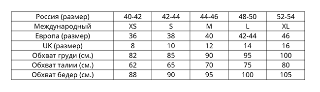 Женские размеры (международный — российский): XS — 40/42, S — 44, M — 46-48, L — 50, XL — 52/54, XXL — 56, XXXL — 58. Мужские размеры (международный — российский): S — 46/48, M — 48/50, L — 50/52, XL — 52/54, ХXL — 54/56, XXXL — 56/58.