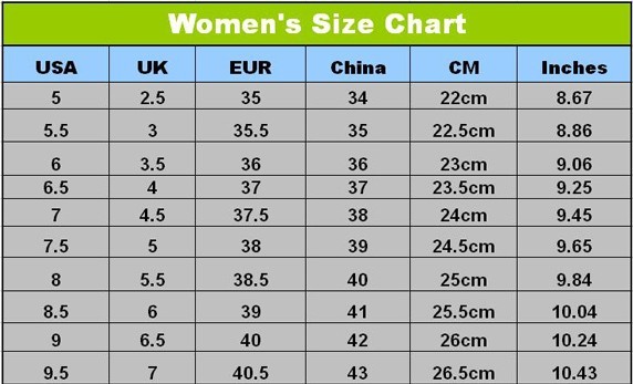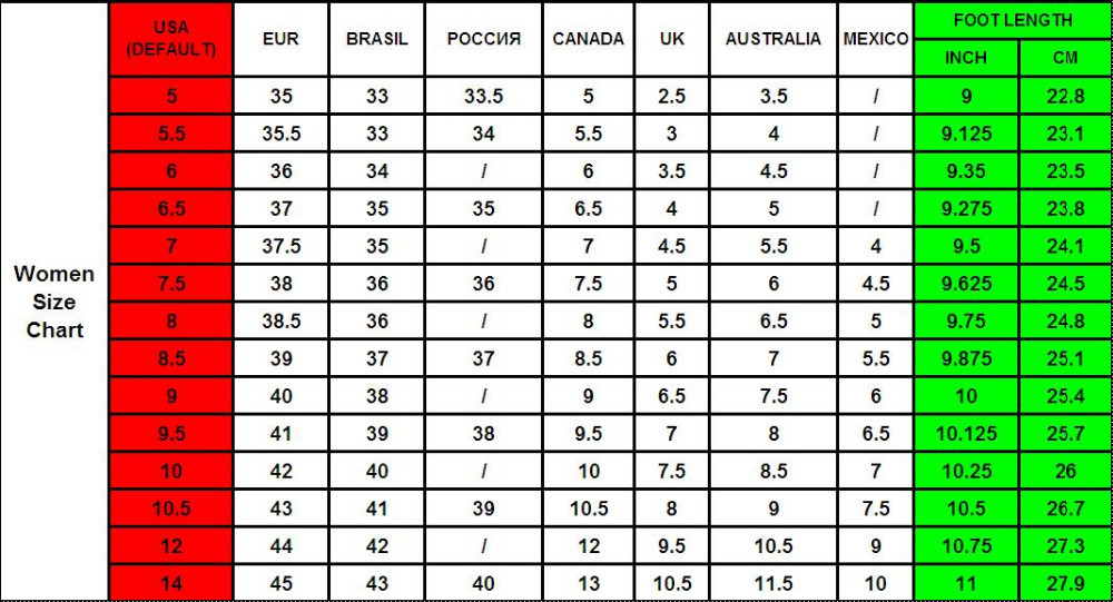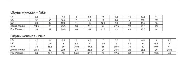 ТАБЛИЦА РАЗМЕРОВ ДЛЯ ЖЕНСКОЙ И МУЖСКОЙ ОБУВИ