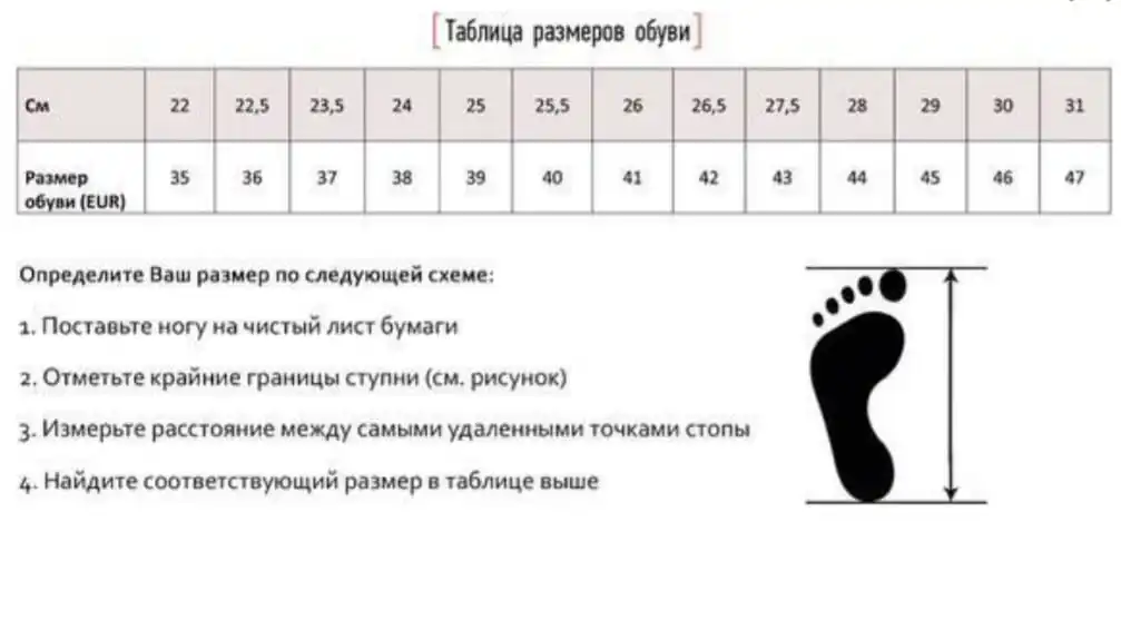 Для определения вашего размера необходимо точно знать длину обеих стоп, так как они у многих людей отличаются по размеру.