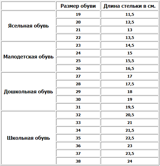 | Длина стельки (см) | 7 | 7.5 | 8 | 8.5 | 9 | 9.5 | 10 | 10.5 | 11 | 11.5 | 12 | 12.5 | 13 | 13.5 | 14 | 14.5 | 15 | 15.5 | 16 | 16.5 |